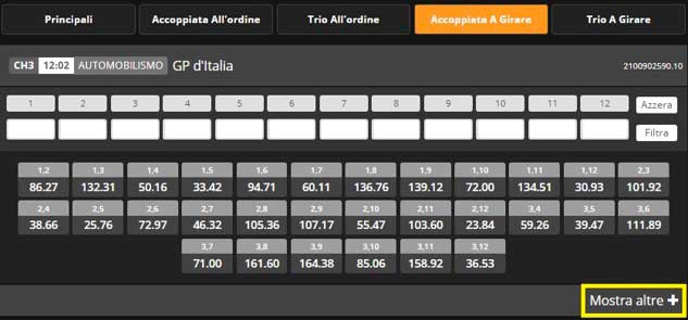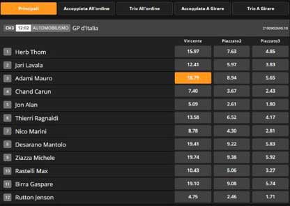 Individuato l’evento di automobilismo su cui scommettere, al centro della lobby si può selezionare