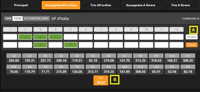 Nella parte bassa sono visualizzate le combinazioni con le relative quote (B).