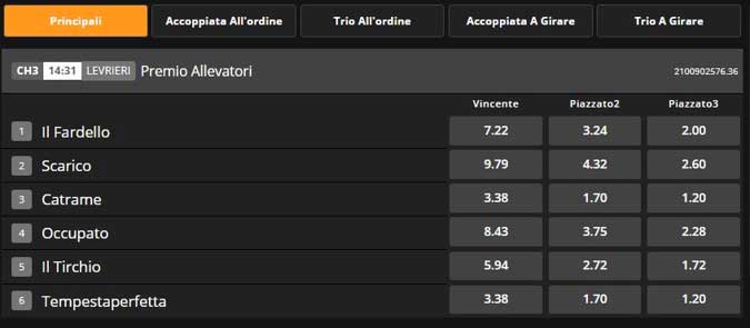Di default sono presenti le quote delle scommesse Principali: Vincente, Piazzato2, Piazzato3